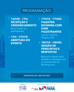 A SETUR, em parceria com a plataforma Booking, realiza na próxima terça-feira (18/02) a 2ª edição do Workshop sobre o cadastro de propriedades para a COP-30 na Booking.com. O evento é presencial e gratuito, às 16h.O objetivo do evento é apresentar a plataforma aos interessados e suas possibilidades de locação de apartamentos e casas por temporada na região, com tutorial sobre como realizar registro dos imóveis, otimização e visibilidade dos anúncios, métodos de pagamento e serviço ao consumidor.