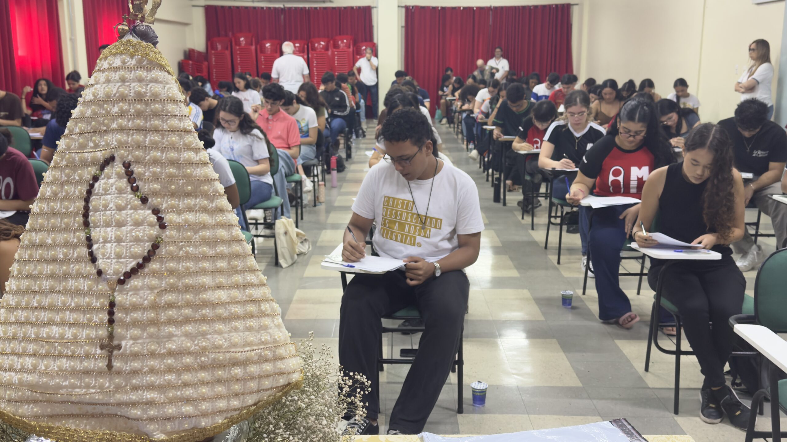 O tema da prova foi “A proteção da casa que partilhamos como ato cristão”, estimulando os estudantes a refletirem sobre o cuidado com a criação e a responsabilidade coletiva com o meio ambiente.