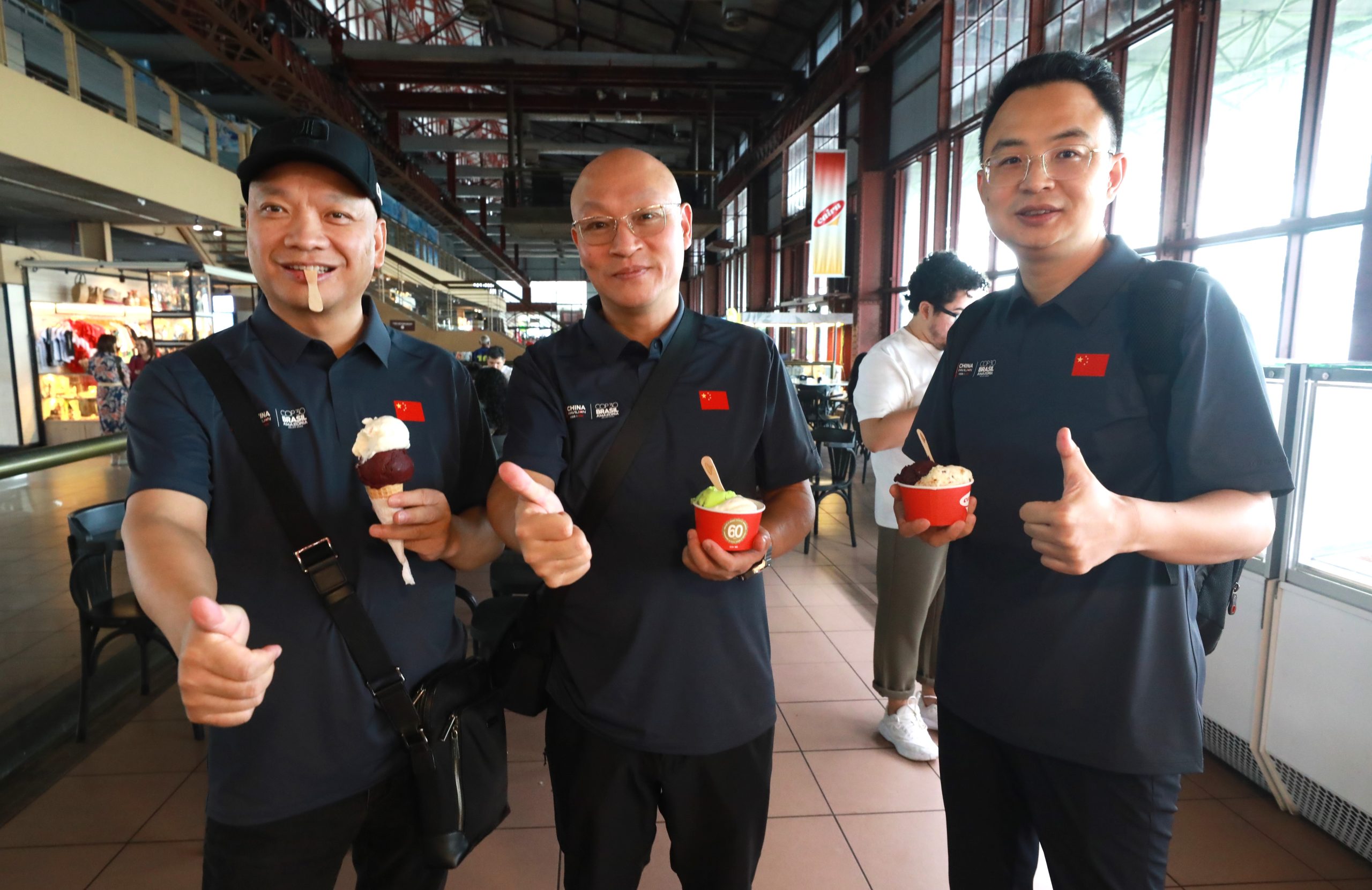 Entre os grupos que passaram pelo complexo turístico estava parte da delegação chinesa — Lau, Ruan, Huang e Lin — que visitou a Estação das Docas pela primeira vez para conhecer a arquitetura, a vista da Baía do Guajará e, claro, experimentar os tradicionais sorvetes de frutas amazônicas.