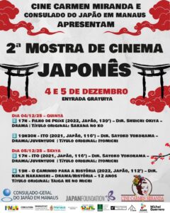 O Consulado Geral do Japão em Manaus, Fundação Japão e o Cine Carmen Miranda realizam nos dias 04 e 05 de dezembro, a Mostra de Cinema Japonês 2025, com entrada gratuita. A programação reúne três peliculas lançadas no Japão entre 2021 e 2022, todos exibidos em japonês com legendas em português e inéditas em Manaus.