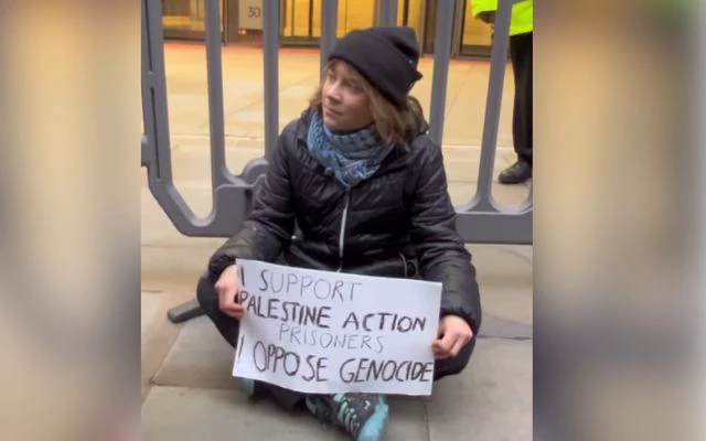 A jovem foi detida com base na lei antiterrorismo por exibir um cartaz que dizia: “Apoio os presos do Ação Palestina. Oponho-me ao genocídio”.