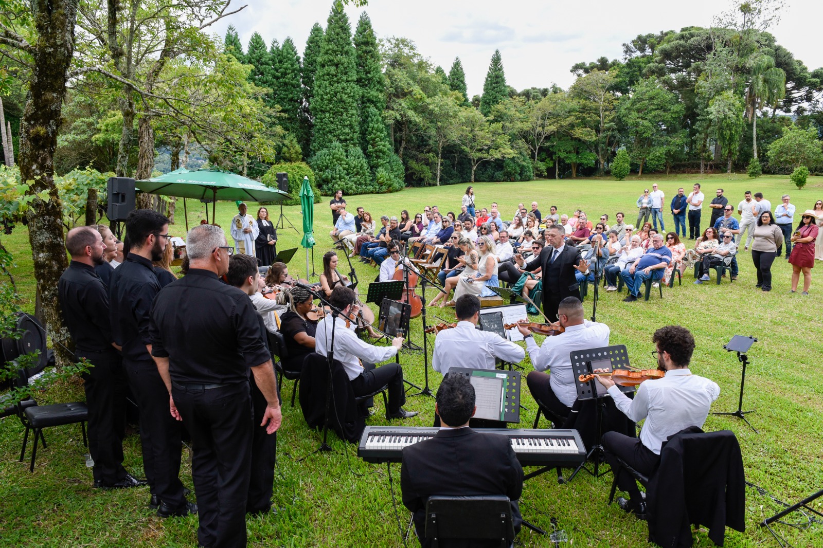 Em meio aos vinhedos, a abertura contou com uma apresentação especial da Camerata de Cordas da Orquestra Sinfônica de Gramado, com participação do Coral Vozes de Gramado, criando um clima sensível e acolhedor para o início da programação. Na sequência, uma celebração ecumênica, conduzida pelo padre Neimar Pies e pela pastora Camila Elisa Schütz, reforçou valores como gratidão pela colheita, cuidado com a terra, união e respeito à diversidade.