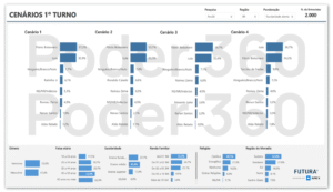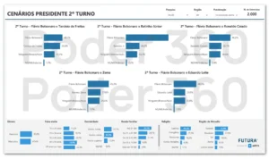 1º TURNO O estudo também testou possíveis cenários de 1º turno. O presidente Lula empata contra Flávio Bolsonaro nos 4 cenários testados. Em 3 deles, o petista aparece numericamente atrás do filho do ex-presidente Jair Bolsonaro (PL).