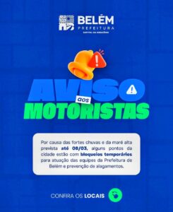 A Prefeitura de Belém, por meio da Secretaria de Segurança, Ordem Pública e Mobilidade de Belém – Segbel, intensificou a atuação de agentes de trânsito e transporte em pontos estratégicos da capital durante a Operação Maré Alta para garantir segurança e fluidez nas vias principais e adjacentes. A ação ocorre especialmente na avenida Visconde de Souza Franco (Doca), uma das áreas mais impactadas pelos alagamentos provocados pelos picos de maré. Ontem, quarta-feira, 04, choveu o dia todo. A chuva entrou pela noite, madrugada e continua chovendo. A maré alta vai ocorrer por volta das 14h.