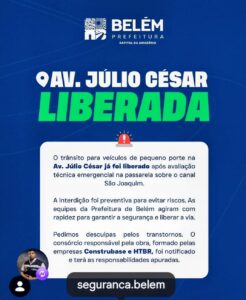 A Prefeitura de Belém informa que o tráfego de veículos na avenida Júlio César, nas proximidades do canal São Joaquim e do Parque São Joaquim, foi totalmente liberado para veículos de pequeno porte no fim da madrugada deste sábado (7) após a conclusão das avaliações técnicas emergenciais realizadas pela Secretaria Municipal de Obras e Infraestrutura (Seinfra) na passarela de pedestres localizada sobre o canal. Carretas e caminhões cegonha que circulam pela via são desviados pelos agentes de trânsito, que estão presentes no local e monitoram o trânsito.