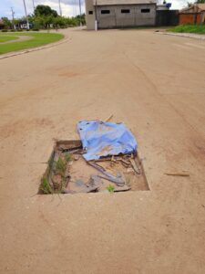 Um tabuleiro de proteção de uma bueira, bem na rotatória da avenida principal e no meio da rua, afundou. No local não foi afixada nenhuma sinalização de advertência. Um risco de acidente para motoristas, condutores de motos e até mesmo para pedestres. Falta de manutenção no único brinquedo que foi colocado na pracinha, justamente na rotatória, já provocou incidentes leves em algumas crianças que ali se divertem, quando não está chovendo.