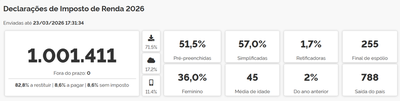A Receita Federal recebeu até as 17h30 horas desta segunda-feira (23/03) 1.001.411 declarações do Imposto de Renda Pessoa Física (IRPF). O prazo para entrega de declaração teve início às 8h desta segunda-feira (23/03) e estende-se até o último minuto do dia 29 de maio. A expectativa do órgão é receber 44 milhões de declarações dentro do prazo legal.